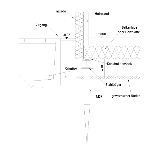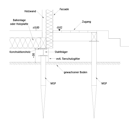 Große Vorteile sind der Zugwiderstand und der Einbau mit Hand oder kleiner Maschine. Die Pfähle sind rückbaubar und es bedarf keiner Bodenbewegungen. Gebäude können circa 30cm über dem unveränderten Gelände geplant werden und man spart sich somit die Abdichtung gegen das Erdreich. Ein ebenerdiger Zugang ist trotzdem an den notwendigen Bereichen problemlos möglich. Weiter unten finden Sie denkbare Details.